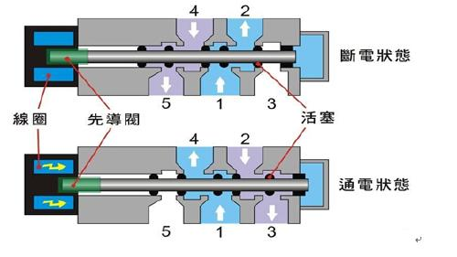 如图,表示5/2(五路二位)直动式电磁阀(常断型)结构的简单剖面图及工作原理。起始状态,1,2进气﹔4,5排气﹔线圈通电时,静铁芯产生电磁力,使先导阀动作,压缩空气通过气路进入阀先导活塞使活塞启动,在活塞中间,密封圆面打开通道,1,4进气,2,3排气﹔当断电时,先导阀在弹簧作用下复位,恢复到原来的状态。